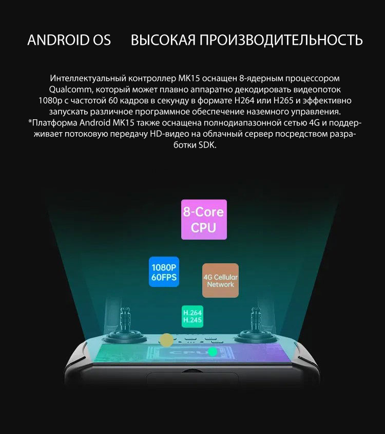 На передней панели контроллера находится качественный сенсорный экран. На нём есть все необходимые данные для комфортного полёта и мониторинга процесса. Ручки управления сделаны так, чтобы было удобно держать исключая неудобство даже при длительном использовании.